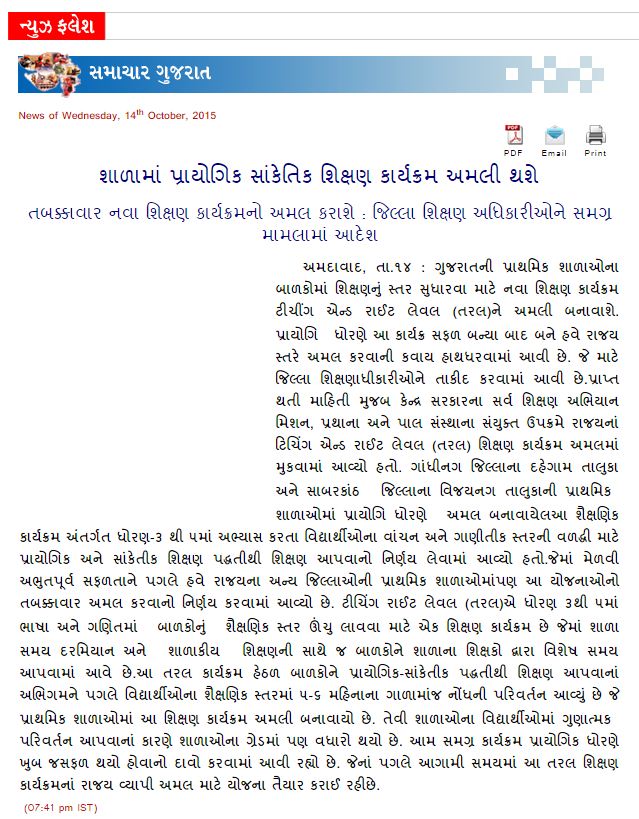 गुजरात प्राथमिक शालाओमा नवो प्रोजेक्ट – टीचिंग एन्ड राइट लेवल (तरल) प्रायोगिक सांकेतिक शिक्षण कार्यक्रम